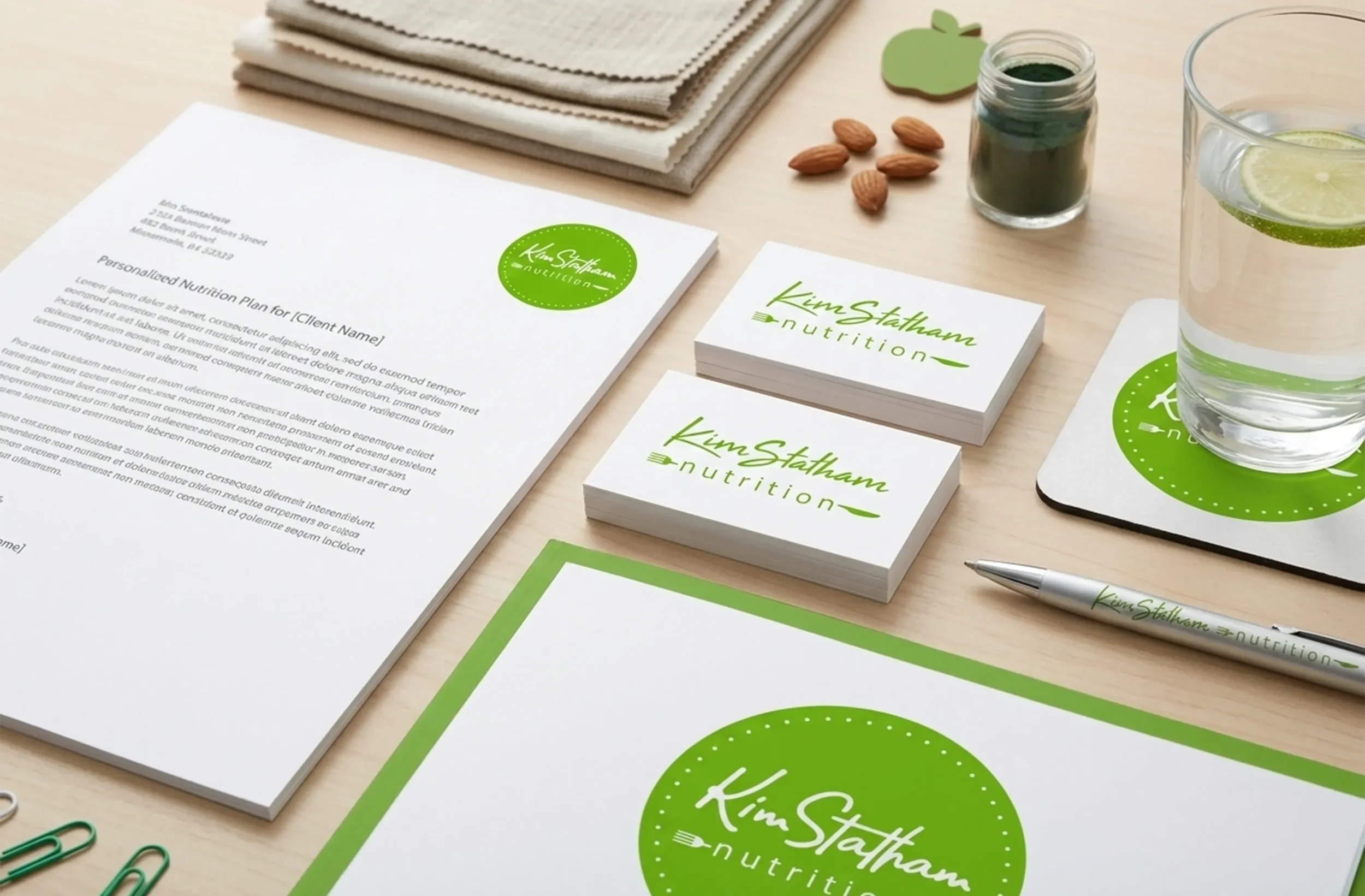 Kim Statham, an online nutrition specialist, needed a cohesive visual identity that clearly communicated her brand's commitment to wellness and transparency. The goal was to create a clean and simple logo that reflected the core values of "health" and "nutrition." To do this, I chose a fresh, crisp green palette that conveys an immediate, organic, and vibrant feel aligned with natural vitality. The final design combines modern, handwritten-style typography with minimalist cutlery icons, anchoring the brand in the practical world of dietary expertise.